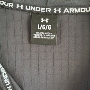 Under Armour black jacket with a textured pattern. Features a hood and full zip closure. In good condition just a small spot on the left sleeve as seen in pics.