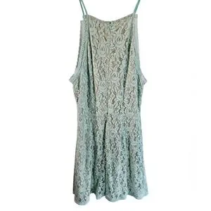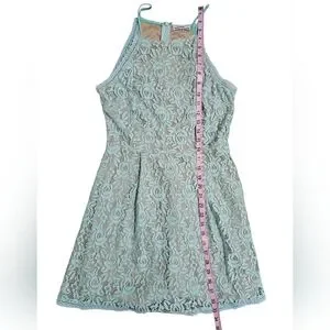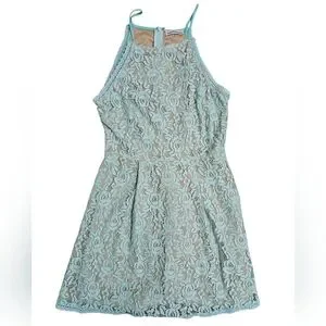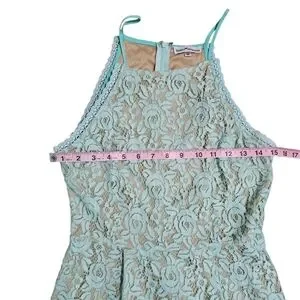Dainty Hooligan women’s mint floral lace skater dress in size Medium. Features a beautiful mint lace overlay with a nude lining, fitted bodice, and a flared A-line skirt. High halter neckline with thin straps and a back zipper closure. Perfect for parties, spring events, graduations, and date nights.