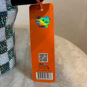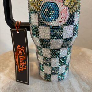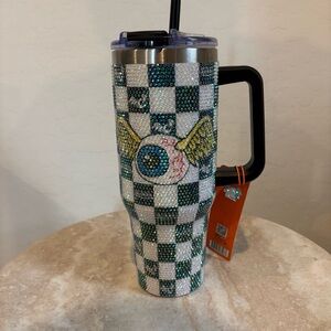 A black and white colored checkerboard print with flying eyeball design and blue shift colored rhinestones over the entire tumbler cup, brand new with tags, never used!
