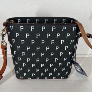 Black pebbled leather Dooney & Bourke crossbody bag. Zipper pocket on the front & zippered top. Small Pittsburgh Pirates P logos all over in white. Classic neutral colors. Gold colored hardware. New with tags!
