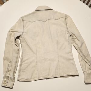 super cute cowgirl/boy longsleeve. cool canvas cotton with a subtle bluish streaking through the tan. xs womens, or could totally fit a child's medium/large. amazing embroidery and really neat ivory snap buttons.it does have a very fixable loose embroidery on one of the front pockets.(last photo) otherwise, in perfect condition.