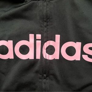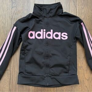 Adidas kids jacket with bold pink stripes. Lightweight athletic material, full front zipper and fitted cuffs. Comfortable and stylish for everyday wear.