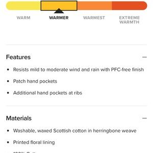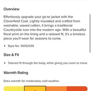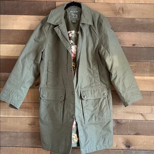 Ariat cloverfield coat in the color Earth. Features button closure and front pockets. This jacket is beautiful and has printed floral lining. I bought and never wore! And has been in my closet! It is NWOT