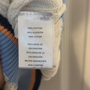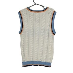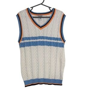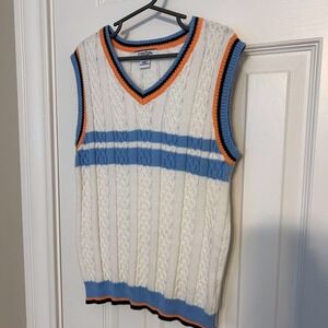 Description: Vintage white with blue stripes and blue/orange/black trim detail sweater vest.