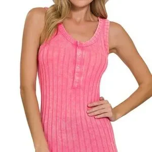 Lot of 2 Zenana Washed Ribbed Scoop Neck Henley Tank Tops