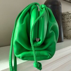 💚 A soft, cloud-like pouch crafted from supple calfskin leather in Bottega’s signature Parakeet Green. Features a magnetic frame opening and a surprisingly spacious interior for its size. A bold yet elegant mini bag that adds a vibrant pop of colour to any look.