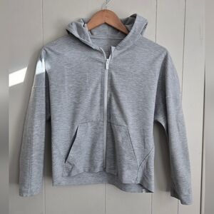 Stylish gray hoodie jacket. Soft fabric. Front zipper closure. Comfortable fit.