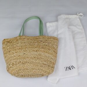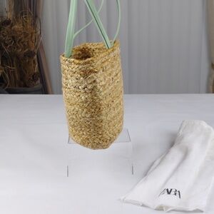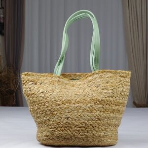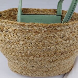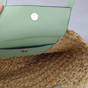 Chic straw tote bag featuring stylish sage green leather handles. Interior leather compartment with magnetic closure. Like new condition. Never used.