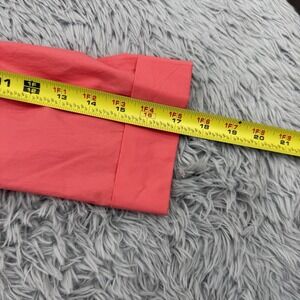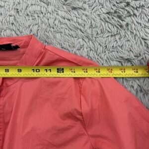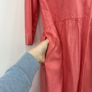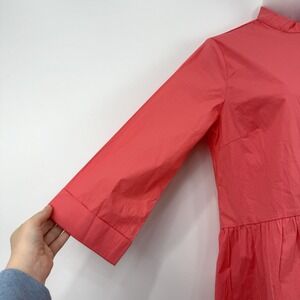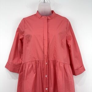 Chic coral dress with button-down front. Features a mandarin collar and three-quarter sleeves. Perfect for casual outings.