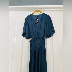 Long, flowing satin dress. Short, loose-fitting and flowing sleeves. V neckline. Asymmetric detail on skirt. Twist on the front. Opening at the waist and back. Concealed zip on back. Ideal for daytime or occasion wear.