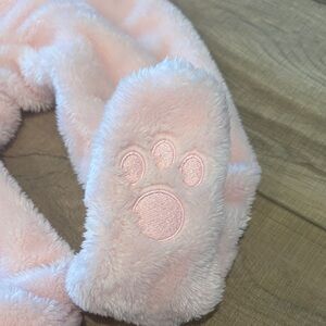 Soft pink footie suit with bear ears. Makes your baby feel like a soft little teddy bear. So cute! Interior is 100% cotton and white with pink stars. Hands fold over to mittens. Magnetic me snaps up. Perfect for a snowy cold day!