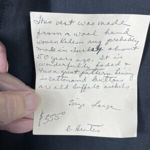 Excellent condition. This garment was handmade from an old Kilim rug, so it has some slight imperfections in the weave but no stains or holes.