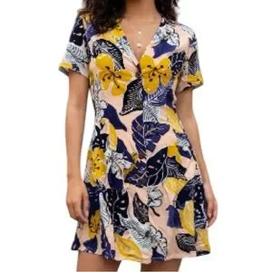 Tropical and form fitting dress. Button down dress with side pockets clings to the curves and compliments any body type.