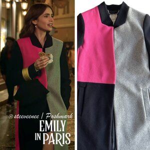 River Island Color Block Longline Coat as seen on Emily Cooper (Lily Collins) in Emily in Paris season 1 episode 9. Same style, brand, and color. Very hard to come by. A UK12 is a US8.