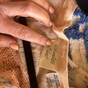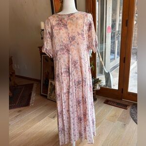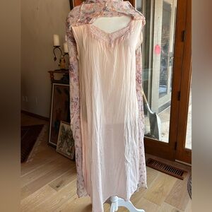 Ethereal vintage sheer floral dress in soft blush tones with an allover pastel flower print and delicate lace-trimmed neckline. Light, floaty, and romantic with beautiful movement—an ideal piece for cottagecore and fairycore styling.