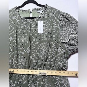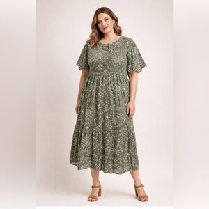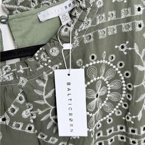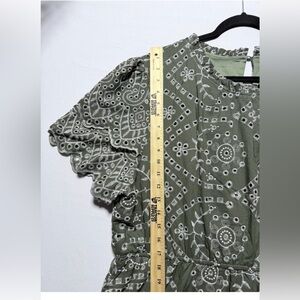 Beautiful embroidered dress by Baltic Born in a muted olive green with white embroidery. Features flutter sleeves, a relaxed empire waist, and a tiered skirt for an easy, flattering boho silhouette.