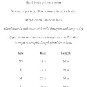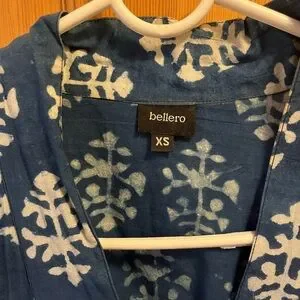100% Cotton made in India with block print fabric. Designed and imported by nyc designer Bellero Designs. Unique. Boutique. Easy to wear. I love the pockets. Blue indigo color. Day or Night.