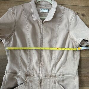 Casual tan jumpsuit with short sleeves. Features front zipper and pockets. Ideal for everyday wear.