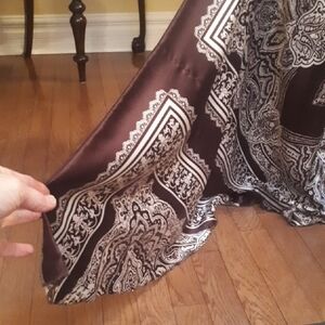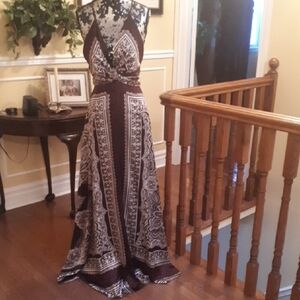 Step out in style with this elegant brown and cream handerkerchief maxi dress. Flowing skirt with a elongated back piece which hits the ground. Sexy backless design with a tie around the neck. Plunging knoted v neck front. Perfect for any occasion, this dress combines comfort with a chic design. A must-have addition to your wardrobe.
