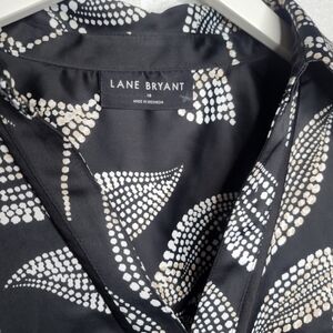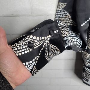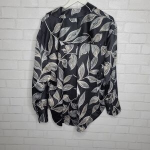 Black satin with pretty leaf print. Deep V neckline, collar and cuffs.