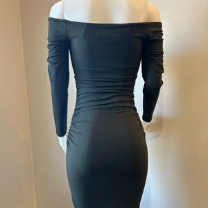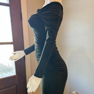 This dress is crazy, sexy, cool! It features an off-the-shoulder neckline, long sleeves, a twisted front with a cutout, and ruched sides. The material is a stretchy blend of nylon and spandex, characteristic of Susana Monaco's signature jersey fabric. This one is in Hunter Green or Emerald Green. Show up wearing this one at your next event and you'll be sure to be the talk of the town.