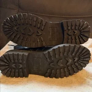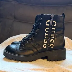 Sleek black combat boots with bold GUESS logo. Lace-up front and side zipper. Rugged sole for durability.