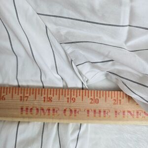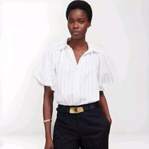 This lightweight Madewell blouse features a crisp white base with thin vertical stripes, bubble short sleeves, subtle shirring at the neckline, and a relaxed button-front silhouette. The rounded high-low hem adds an easy drape, while the airy cotton fabric keeps it soft and breathable.