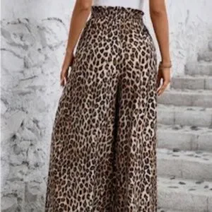 High waisted wide leg leopard print Palazzo Pants with side pockets. Size medium. Worn once to a dinner. Fabric: 89% Viscose, 11% Polyamide. Machine wash. Pull on stretch waist.