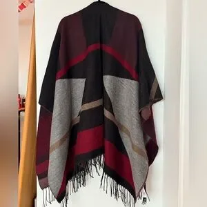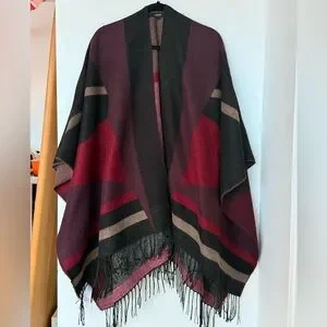 Chic shawl featuring a blend of dark red, black, and grey. Elegant fringe detail adds a touch of sophistication.