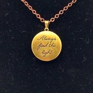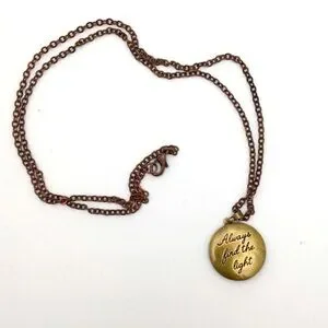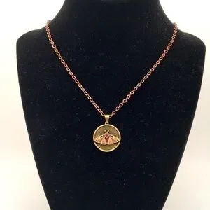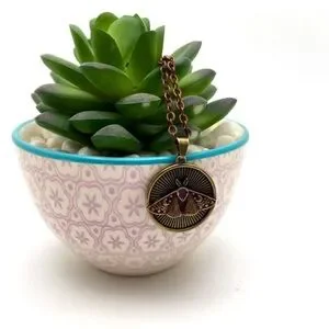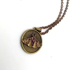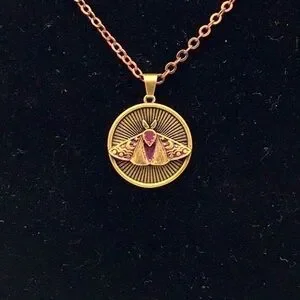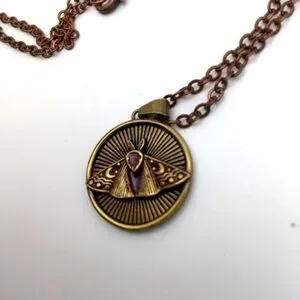This brass moth pendant features celestial details, complemented by a copper chain. Ideal for those appreciating vintage thematic jewelry.