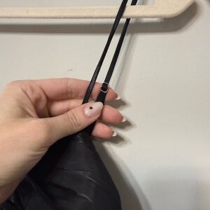 Chic black midi dress with layered design. Features delicate straps and flowing silhouette. Perfect for elegant occasions.