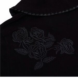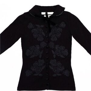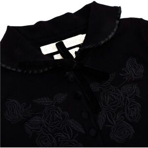 Stretchy black knit w/tonal embroidery in front and back. Black velvet bow and velvet covered buttons.