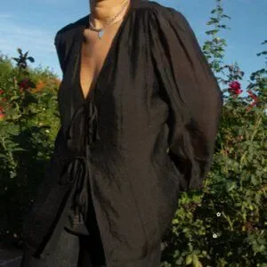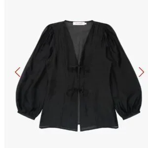 Introducing the Meera Blouse: This lightweight black organza blouse with puff sleeves, a tie front, and flattering silhouette is perfect for all your winter occasions. Wear the ties in the front for an exposed look!