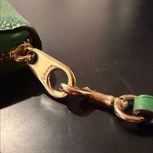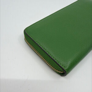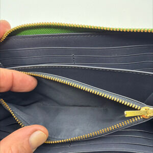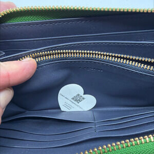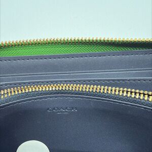 Elevate your everyday essentials with this vibrant Coach Accordion Zip Wallet with Wristlet, crafted from luxurious green pebbled leather. This stylish and highly functional accessory features a secure zip-around closure, opening to a meticulously organized navy blue interior. Inside, you'll find ample space for your cards, cash, and coins, including multiple card slots, full-length bill compartments, and a central zippered coin pocket. The signature gold-toned hardware, including the iconic Coach horse and carriage logo on the front and engraved zipper pull, adds a touch of refined elegance. Complete with a convenient detachable wrist strap, this wallet offers versatile carrying options, perfect for slipping into a larger bag or carrying as a chic standalone clutch for quick errands. In excellent, near-new condition, this Coach wallet is a testament to enduring style and practicality.Key FeaturesZip-around closureMultiple card slotsFull-length bill compartmentsInterior zip coin pocket