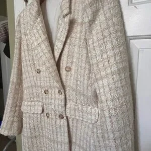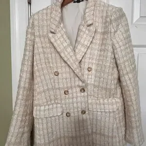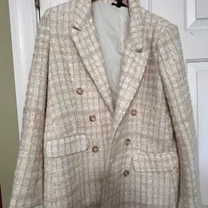 Chic Aqua tweed blazer in a soft cream hue with gold-tone buttons. Double-breasted design with structured shoulders, flap pockets, and full lining. Made from a textured polyester blend that gives a refined look. Size L — elegant and versatile for work or dressy occasions.