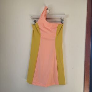 Outdoor Voices dress, one shoulder dress, mini dress, colorblock dress, athletic dress, nylon dress, spandex dress, workout dress, casual dress, pink dress, yellow dress, size s, Outdoor Voices, athleisure, activewear