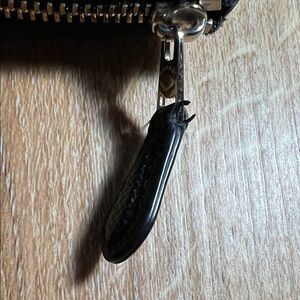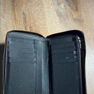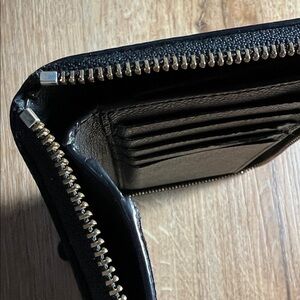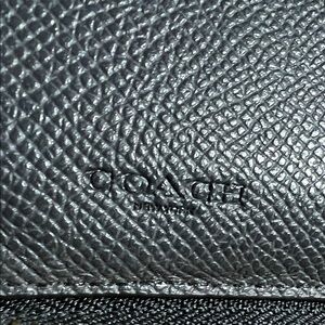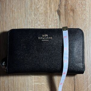 Elegant black wallet by Coach. Textured leather with zip-around design.