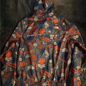 Vibrant windbreaker by The North Face. Features red and blue floral design. Lightweight and stylish. Small barely noticeable flaw on back of right sleeve. In great condition