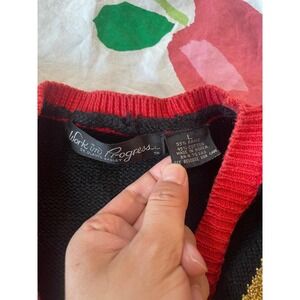 Festive holiday cheer radiates from this delightful Work in Progress cardigan. Embrace the joyous spirit of the season with whimsical appliqués depicting a gingerbread man, holly, bells, and wrapped gifts, all set against a classic black knit. The vibrant red trim and gold accents add a touch of playful sparkle, making this piece a standout for any holiday gathering. Perfect for Christmas parties, family get-togethers, or casual wear throughout the winter season.