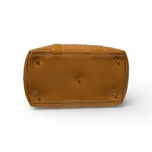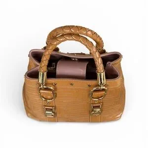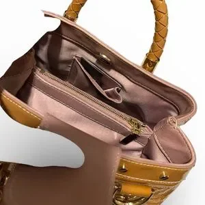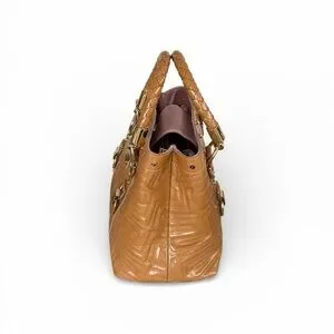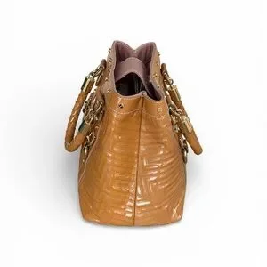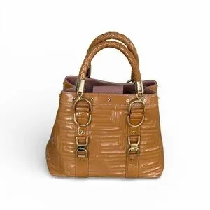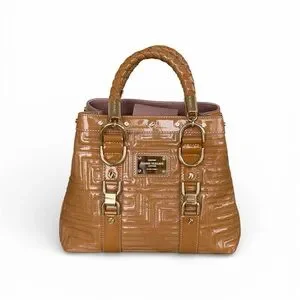 Chic Versace satchel in rich camel quilted patent leather. Stunning mauve colored satin interior & braided like handles.