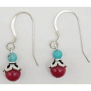 Vtg Southwestern Sterling Silver Turquoise & Coral Earrings 925 Hook Earrings