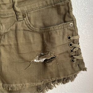 Stylish olive green shorts. Features lace-up side detail. Frayed hem for a casual look.