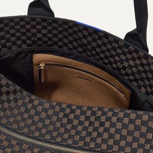 Structured design in a black and camel basketweave pattern, with a double-zipper top closure and durable bag feet.