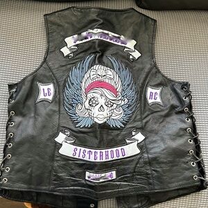 Ladies Black Leather Motorcycle Vest with Patches size XL
