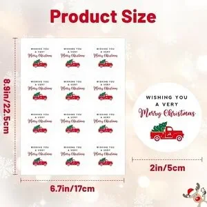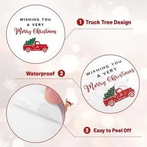 Festive 2in circle stickers featuring a red truck and Christmas message. Perfect for holiday wishes and packaging. Set includes 60 stickers. Waterproof and easy to peel.