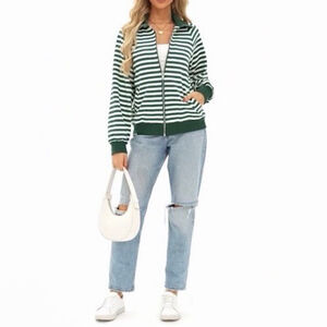 Dokotoo Woman’s Striped Zip Up Jacket•Green/White•Collared Sweater• Size LG•NWT