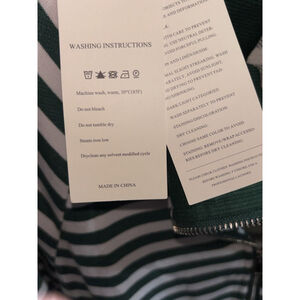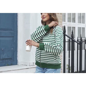 The Dokotoo Woman's Striped Zip Up Jacket in size LG is a classic and versatile piece perfect for casual or travel occasions. Made from a blend of cotton and polyester, this mid-length jacket features a collared sweater style with long sleeves and a zip closure. The green and white striped pattern adds a stylish touch, while the relaxed fit ensures comfort in various seasons. With its quality construction and trendy design, this jacket is a wardrobe must-have for any fashionable woman.