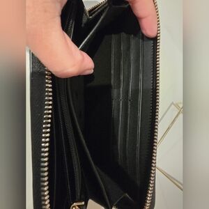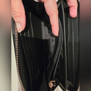 Interior 12 credit card slots, zip coin compartment, 2 slip pockets, bill slots