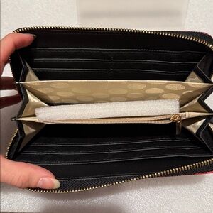 This is a perfect shape Kate spade black and red plaid wallet with glitter on the bottom 1/4. It measures 7.5” x 4”.