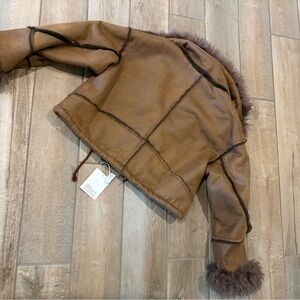 Brown faux leather faux fur trim aviator-style jacket Warm size Large